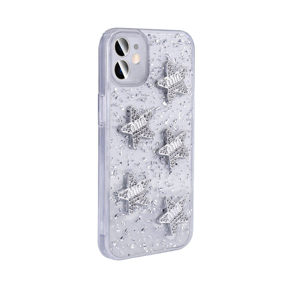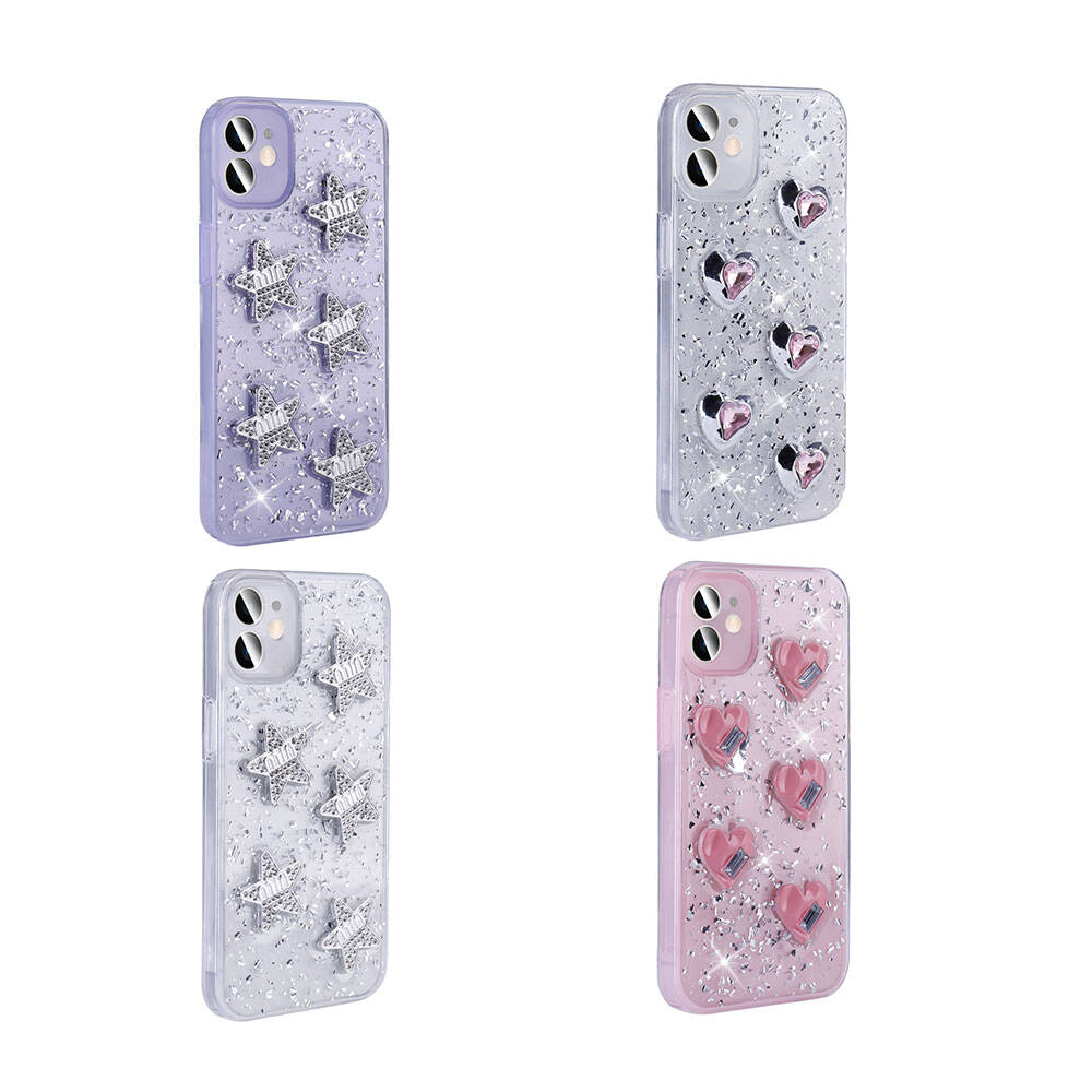 Kalp, yıldız ve fiyonk şekilleriyle birlikte simli tasarım, parıltılı şık arka yüzey yapısı.