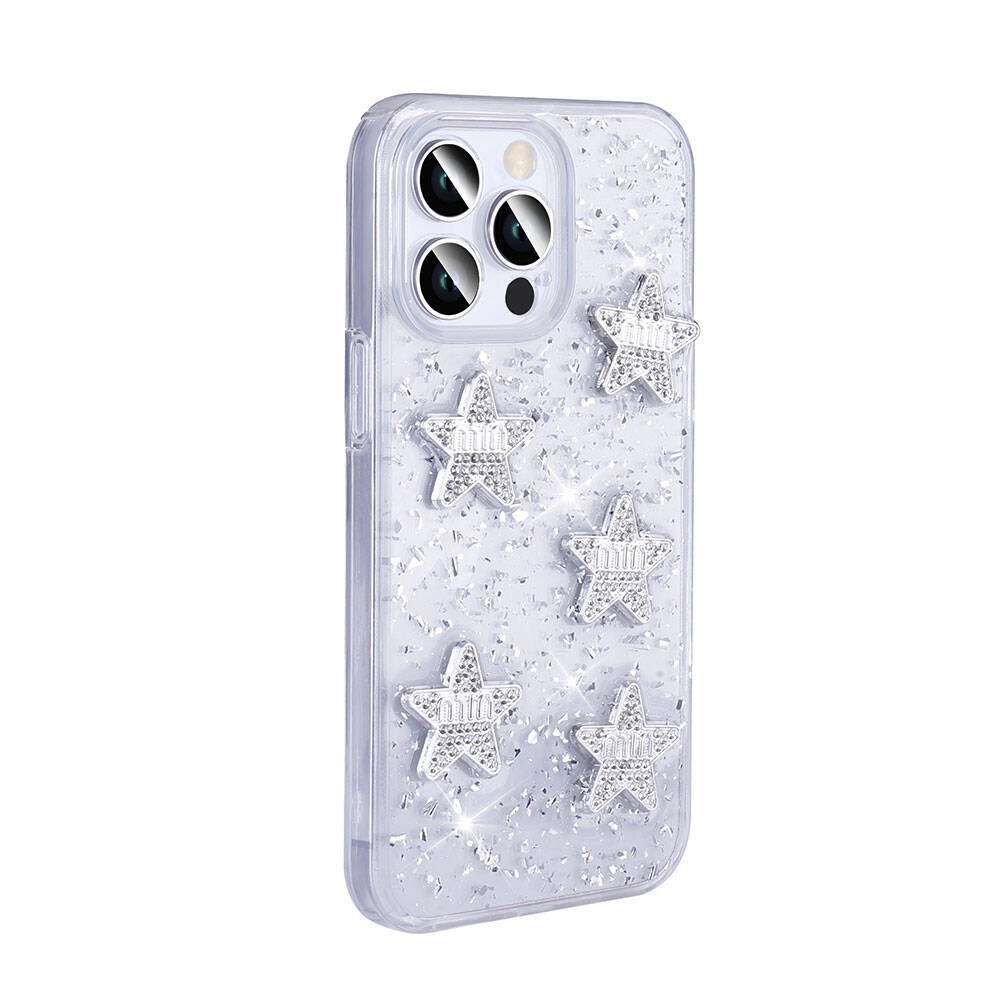 Kalp, yıldız ve fiyonk şekilleriyle birlikte simli tasarım, parıltılı şık arka yüzey yapısı.