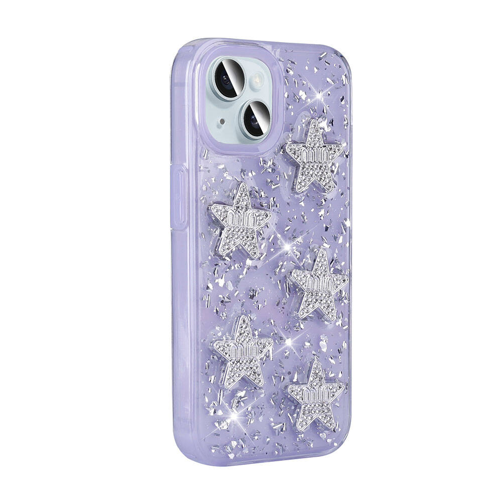 Kalp, yıldız ve fiyonk şekilleriyle birlikte simli tasarım, parıltılı şık arka yüzey yapısı.