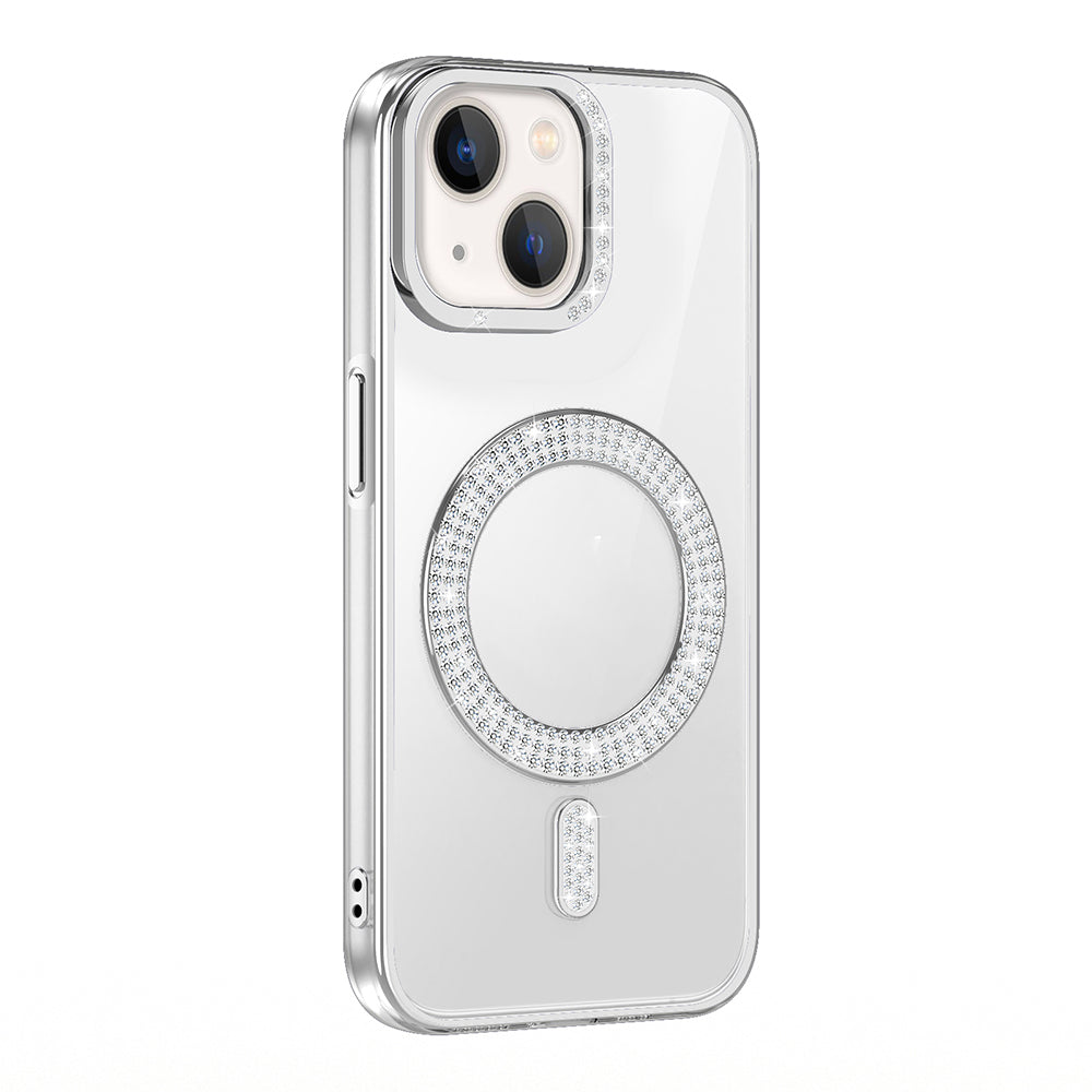 Apple iPhone 15 Kılıf Pırlanta Taş Tasarımlı M-safe Şarj Özellikli Zore Karetta Silikon Kapak Gümüş