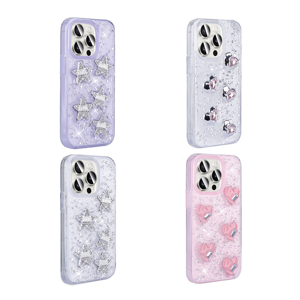 Kalp, yıldız ve fiyonk şekilleriyle birlikte simli tasarım, parıltılı şık arka yüzey yapısı.