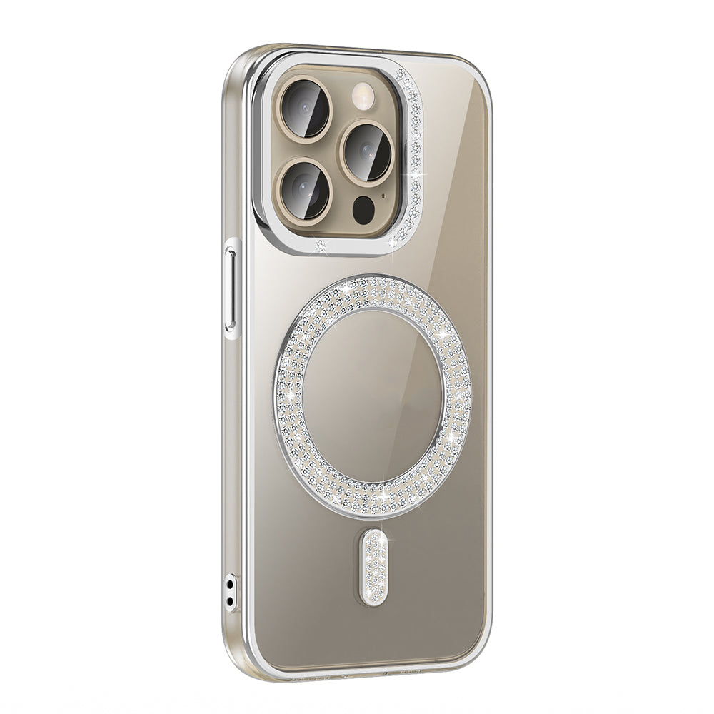 Apple iPhone 15 Pro Max Kılıf Pırlanta Taş Tasarımlı M-safe Şarj Özellikli Zore Karetta Silikon Kapak Gümüş