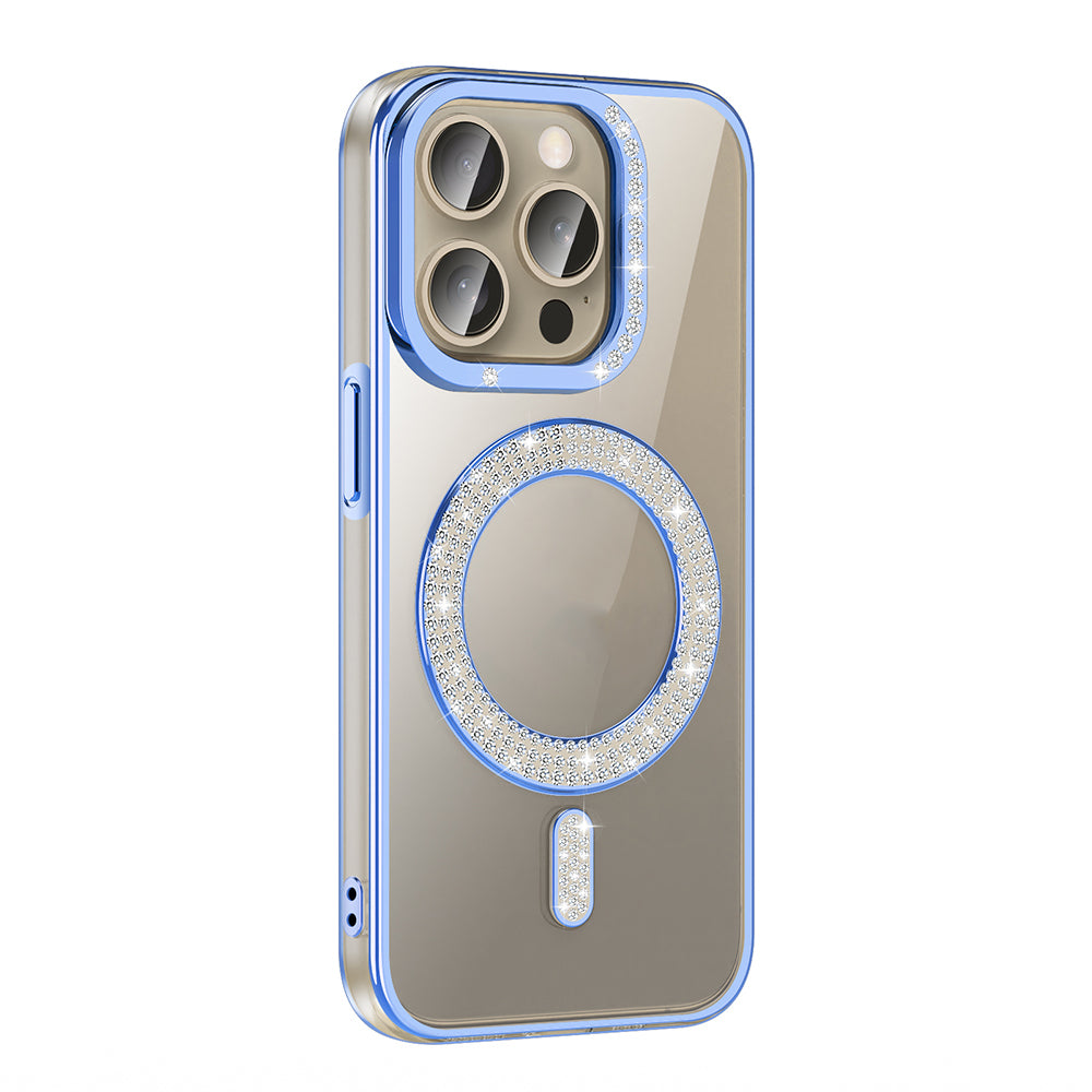 Apple iPhone 15 Pro Max Kılıf Pırlanta Taş Tasarımlı M-safe Şarj Özellikli Zore Karetta Silikon Kapak Mavi